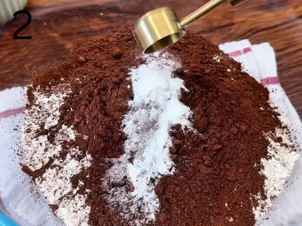 In a separate bowl, combine the flour, cocoa powder, baking soda, baking powder, and salt. Stir well to mix evenly.